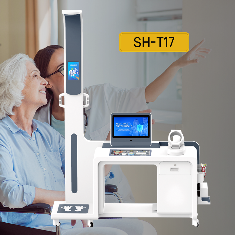 เครื่องจัดการสุขภาพอัจฉริยะ SH-T17 แบบครบวงจรเป็นอุปกรณ์จัดการการตรวจร่างกายแบบบริการตนเองของ IOT ซึ่งส่วนใหญ่ใช้ในหน่วยงานทางการแพทย์ระดับปฐมภูมิ, ศูนย์ดูแลสุขภาพ, สถาบันจัดการสุขภาพ, องค์กรและสถาบันต่างๆ ด้วยเครื่องอ่านบัตรประจำตัวและกล้องในตัว ผู้ใช้สามารถเข้าสู่ระบบเพื่อตรวจร่างกายด้วยตนเอง สร้างบันทึกสุขภาพส่วนบุคคล และอัปโหลดผลการวัดไปยังแพลตฟอร์มทางการแพทย์ผ่านอินเทอร์เน็ต หรือดูรายงานผลลัพธ์บนโทรศัพท์มือถือได้ตลอดเวลา