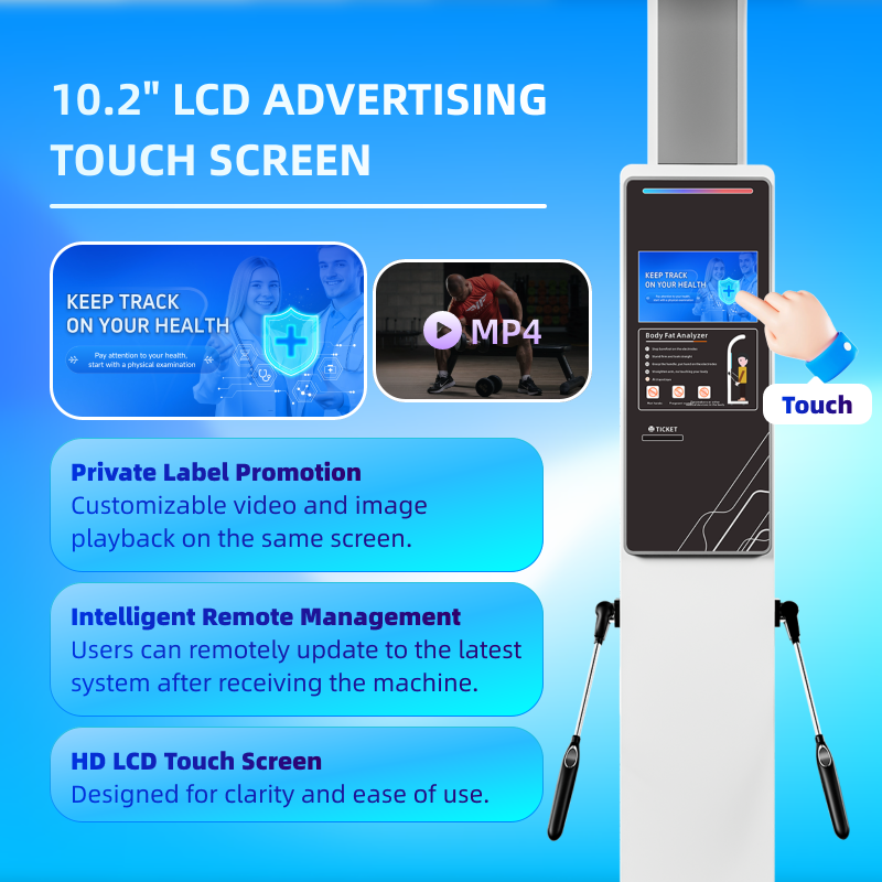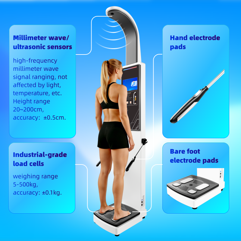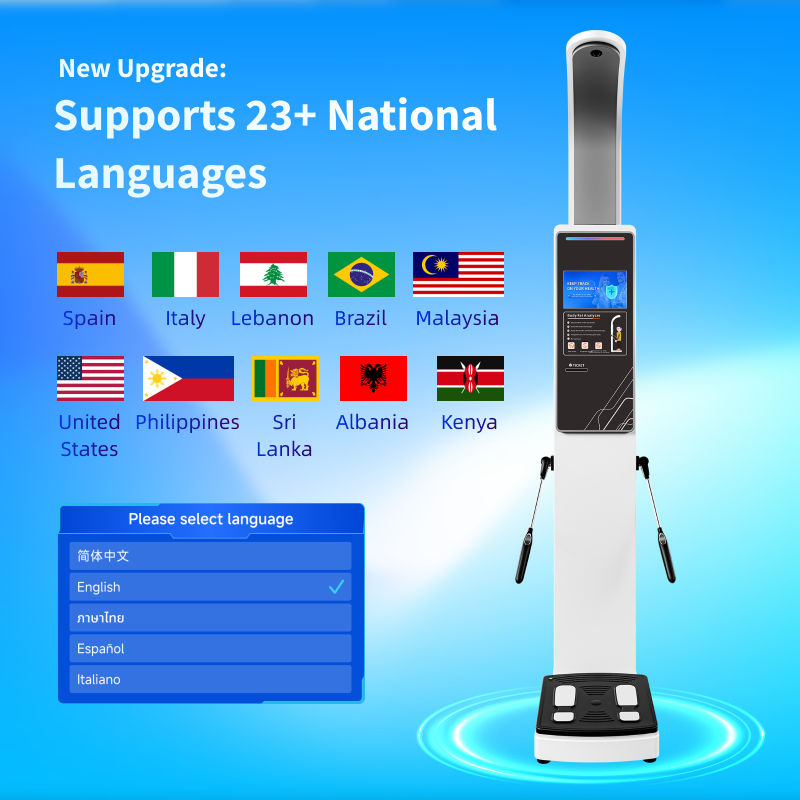 6. เซ็นเซอร์วัดแรงกดแบบสมดุลความแม่นยำสูง7. รองรับ 17 ภาษา รวมถึงภาษาอังกฤษ สามารถสลับภาษาได้อย่างอิสระ8. อิเล็กโทรดสัมผัส 8 จุด, การวัดความต้านทานไฟฟ้าชีวภาพหลายความถี่ (BIA), ขาขวา